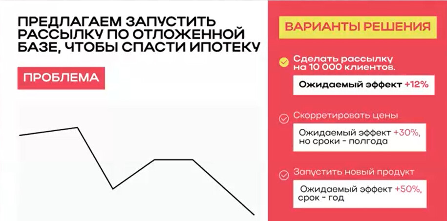- Готовая вилка вариантов. Покажи, что ты не только нашёл проблему, но и знаешь пути её решения. Каждый вариант должен быть подкреплён цифрами или аргументами.