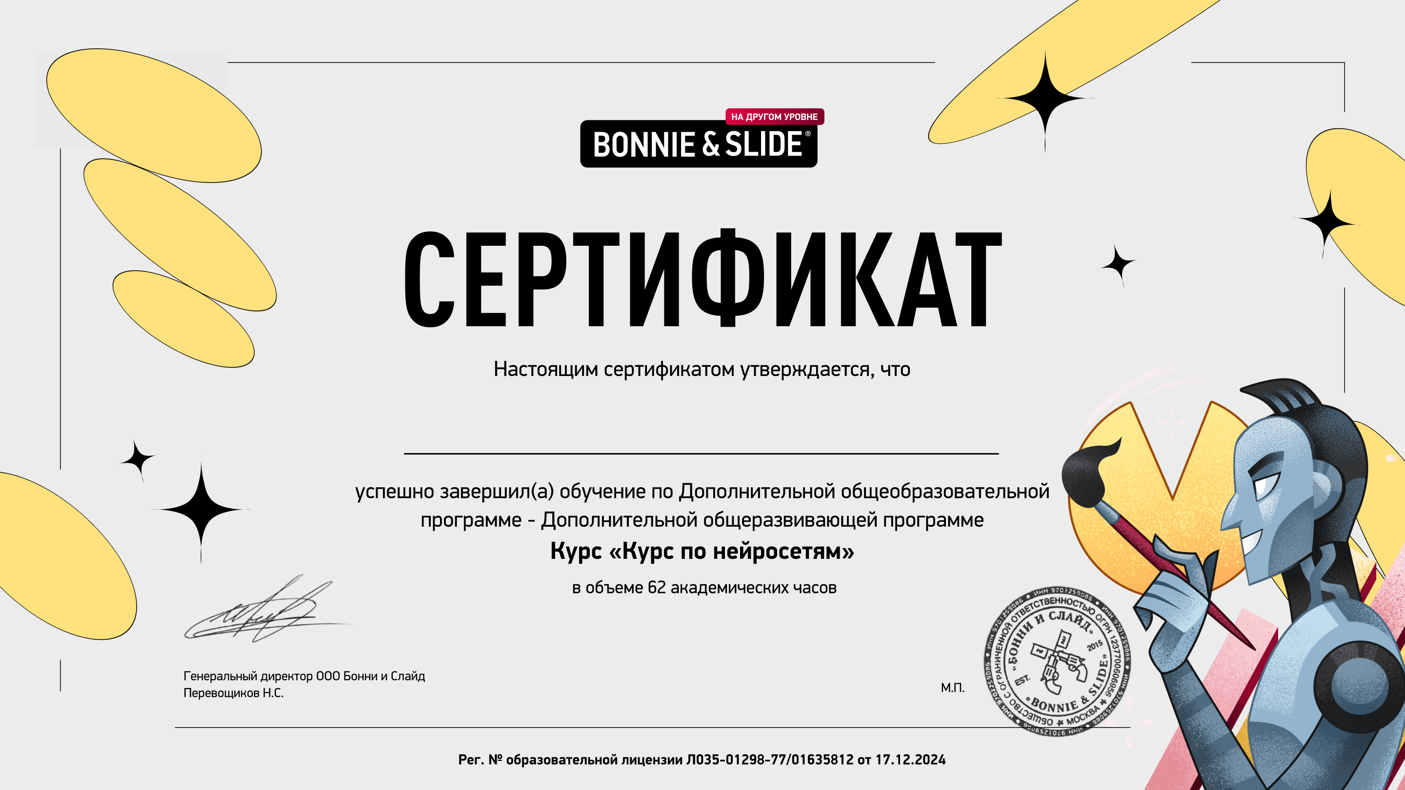 Да, любой курс от B&S, в том числе и курс по нейросетям, завершается экзаменационной работой. Её успешное прохождение будет подтверждено получением сертификата. Кроме того, для получения сертификата необходимо выполнить все практические работы.